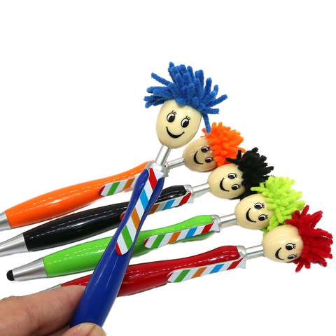 カスタムロゴ印刷された面白いプラスチックモップ人形ヘッドスタイラス子供用ギフトボールペンクリエイティブスマイルフェイストッパースポーツ1.0mm黄色